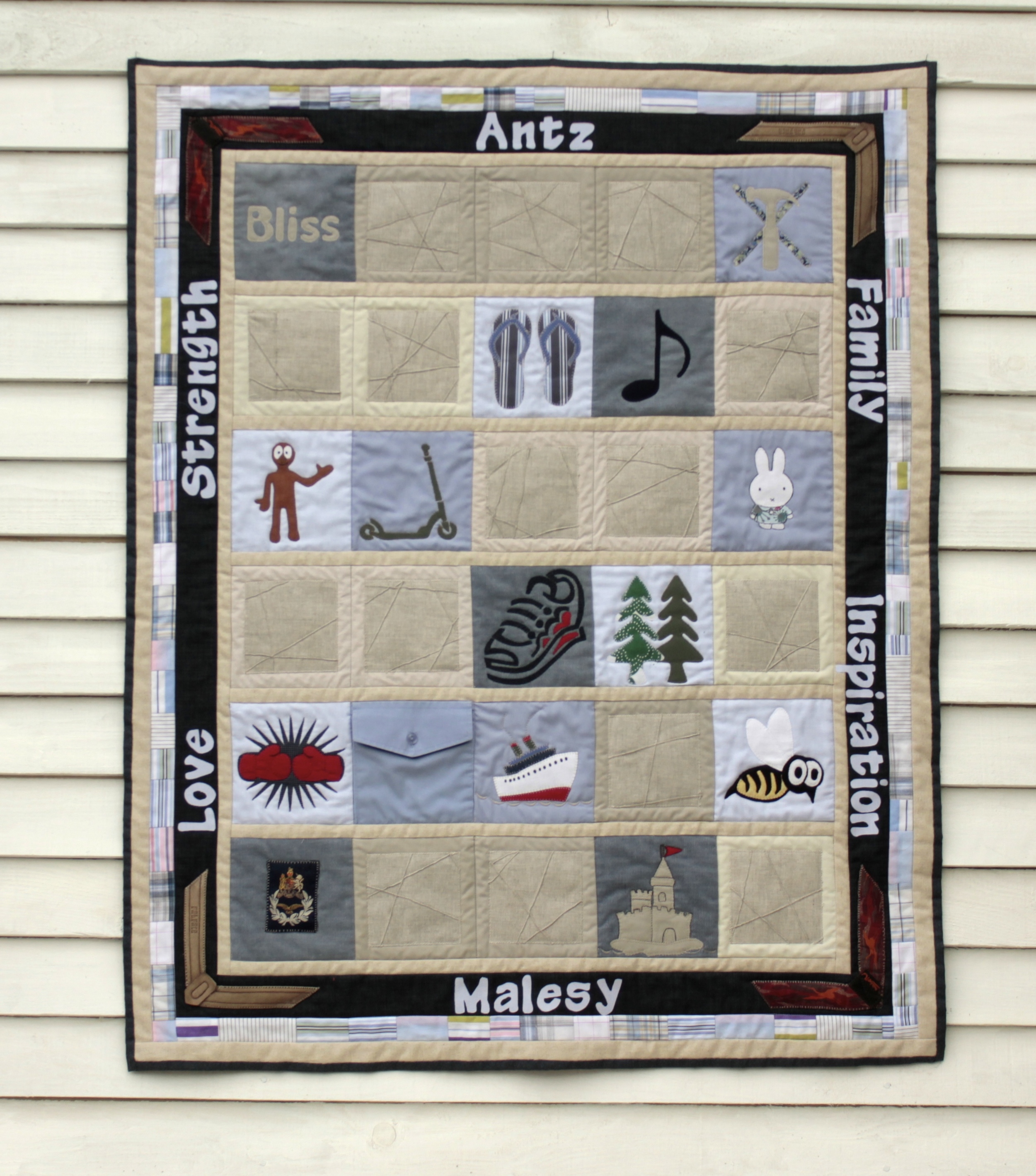 During the design and construction of our beautiful memory quilts we are asked to incorporate many items that hold special memories for our clients. These may be badges or dogs or special characters that will bring a smile and hold a memory. They are all so important and we always try to incorporate them whenever we can.